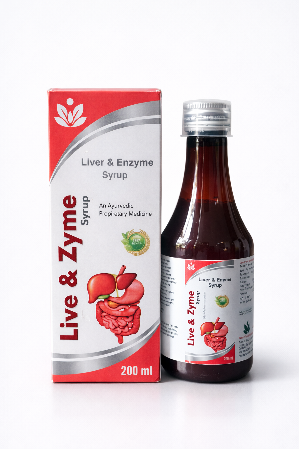 Liver & Enzyme Syrup (Live & Zyme) is an Ayurvedic formulation that supports liver health, improves digestive enzyme activity, enhances appetite, and helps relieve indigestion, acidity, and fatty liver–related discomfort.